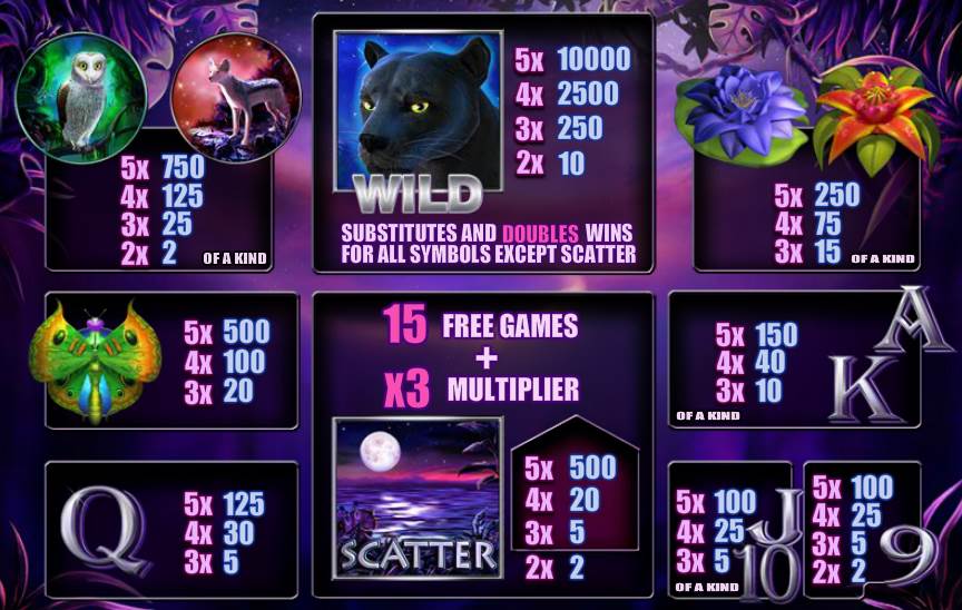 Как видно из списка все символы выдержаны в духе представленной тематики. При этом не обошлось и без рядовых картинок вроде карточных символов. Они самые дешевые здесь, но это не значит, что на них не стоит обращать внимание. Тем не менее более ценными окажутся другие картинки. Также вам будет полезно собираться изображения с Пантерой, которая является диким символом. Именно она поможет закончить выигрышную линию и предоставить вам деньги. Есть еще и Луна, которая является скаттером. Собственно, получив 3 таких вы сможете обзавестись бесплатными вращениями.