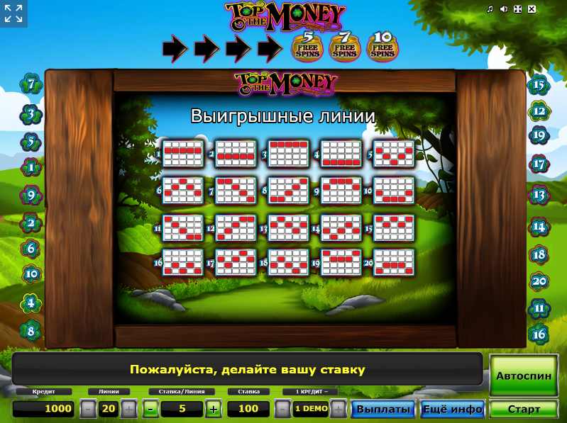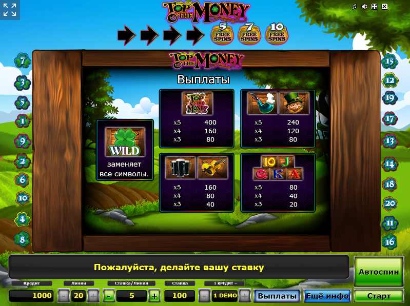 Игра на деньги в Top `o the Money доступна зарегистрированным пользователям клуба Фараон с реальным выводом. С помощью соответствующей кнопки можно выбрать размер ставки на раунд (пересчет по всем линиям выполняется автоматически).